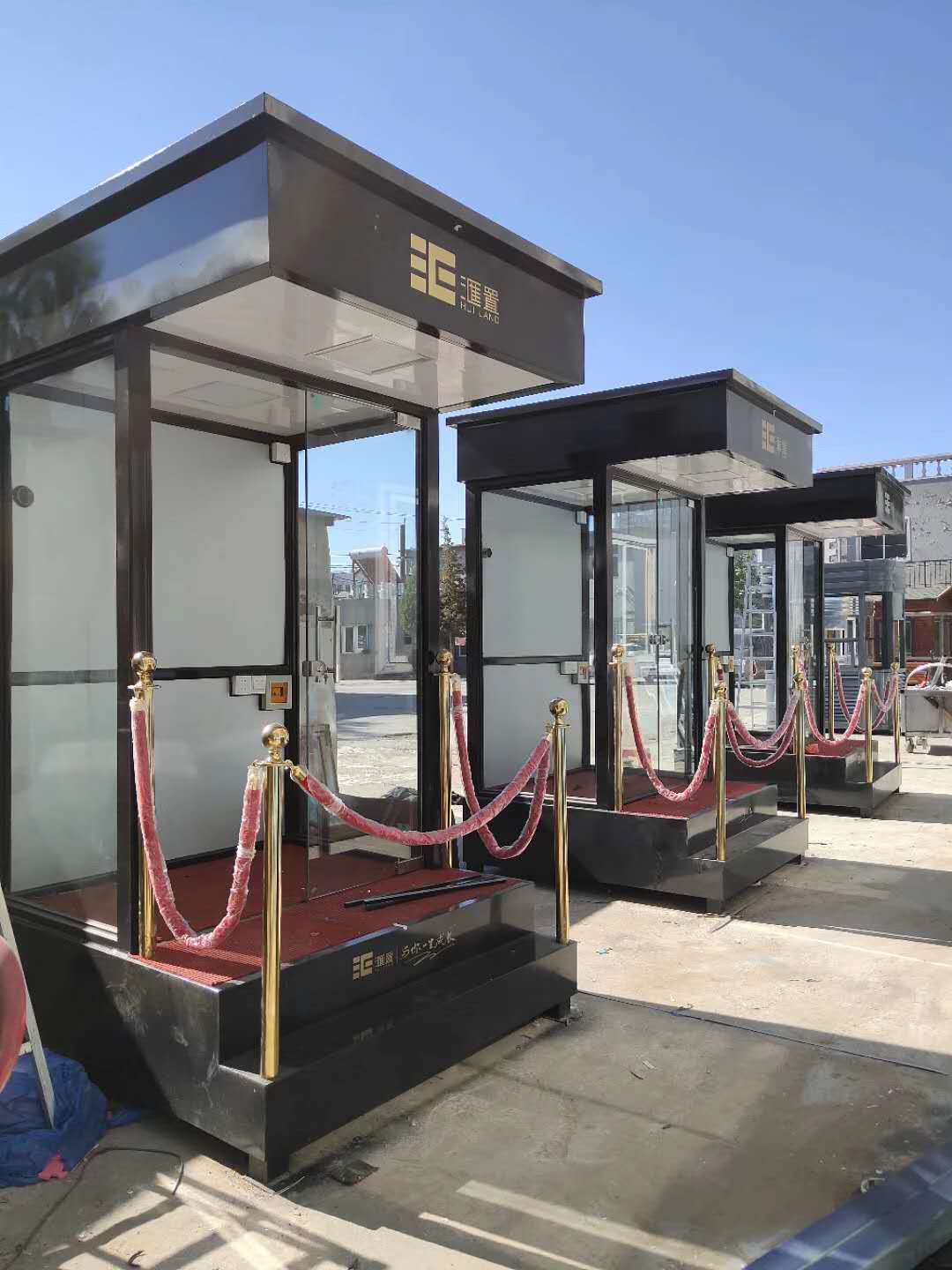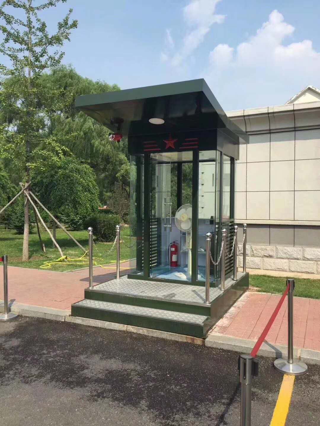 值班崗?fù)さ闹饕埞菫殇摻Y(jié)構(gòu)龍骨,起尺寸為40x60x1.5mm鍍鋅龍骨;立柱一般為堅(jiān)固耐用的型鋼,尺寸規(guī)格有80x80x2.0mm,40x80x2.0mm等等,可根據(jù)產(chǎn)品的大小不同而來決定立柱的大小;玻璃一般為8mm鋼化玻璃,具有較強(qiáng)的抗沖擊力,即使破碎也不會(huì)傷到人;地板為3mm防滑鋼板,鋪紅色地毯,四周可用鈦金立柱和紅絨繩作為裝飾件,使產(chǎn)品看起來更美觀,大氣,高檔。